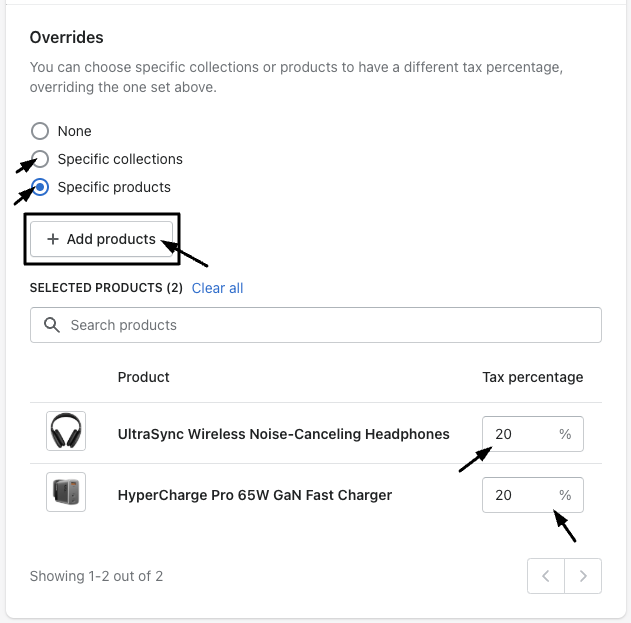 STEP 8: Now, in the Overrides section, choose specific collections or products to have a different tax percentage, overriding the one set above (Tax percentage).