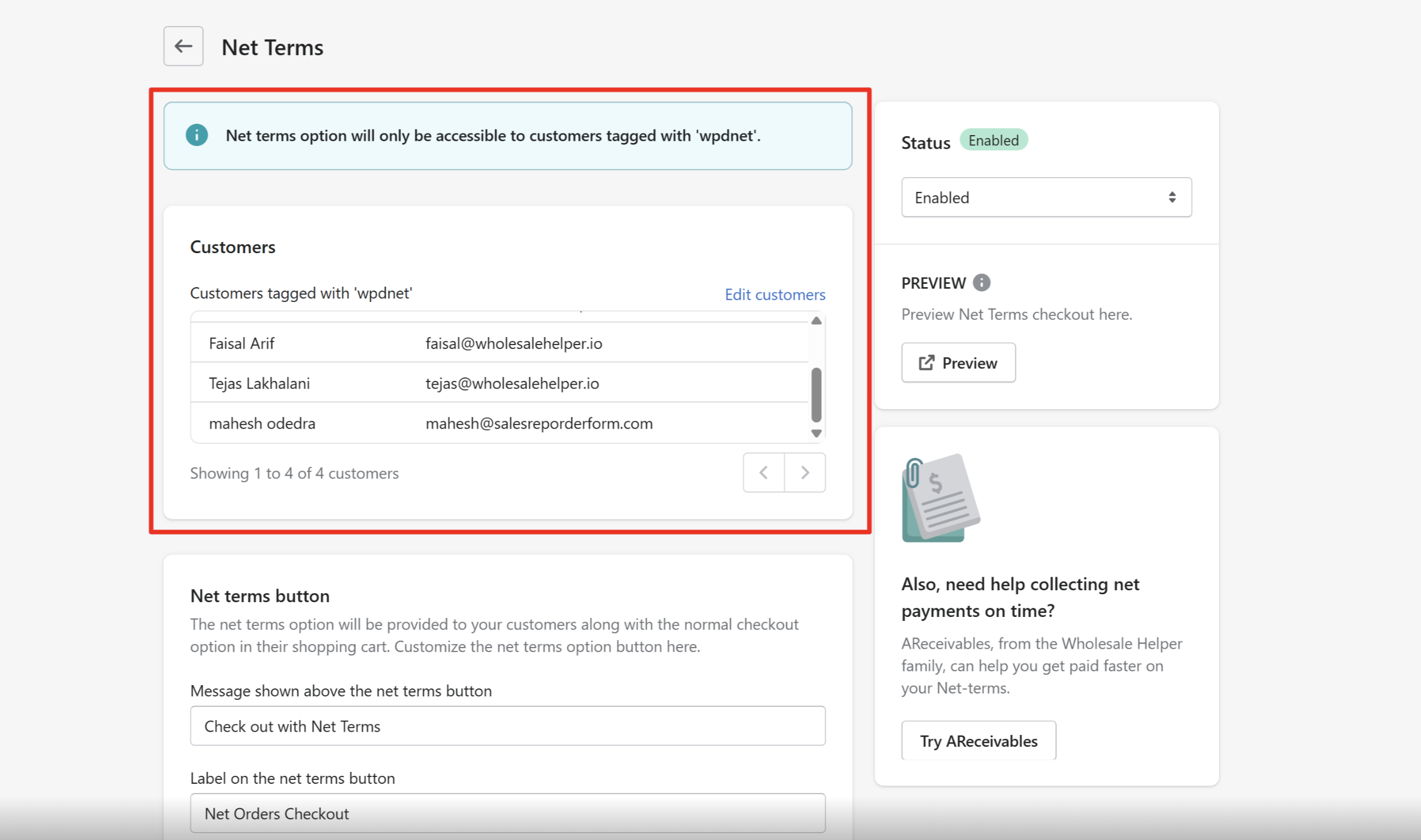 You can now select which customers are eligible for Net Terms by tagging them right in the app. Only customers tagged with the specified tag (e.g., wpdnet) will see the Net Terms checkout option.