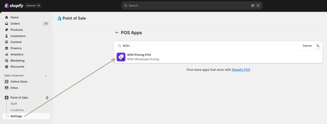 1. In your Shopify admin, go to Sales channels > Point of Sale > Settings > General > POS apps