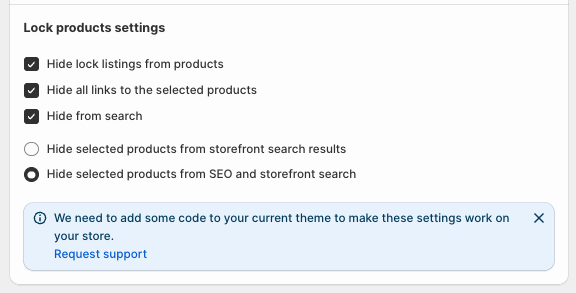 - Storefront privacy (built-in search): The product is automatically hidden from your store’s built-in search results.