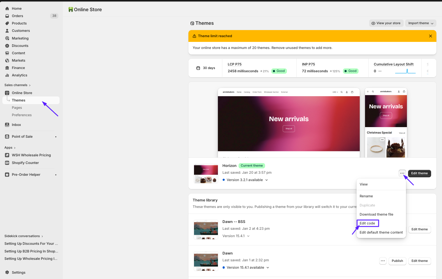 From the sidebar, click on the online store. It will show the themes. As shown in the screenshot below, click “Edit Code” for the theme you want to remove the pre-order code.
