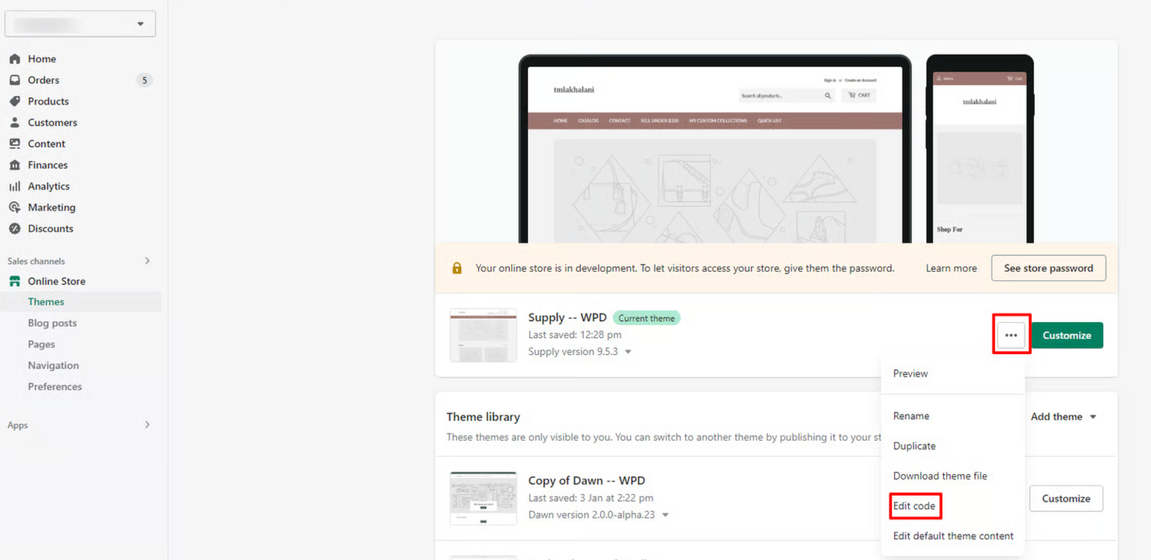 From the sidebar, click on Sales Channels > Online Store > Themes > Edit Code.