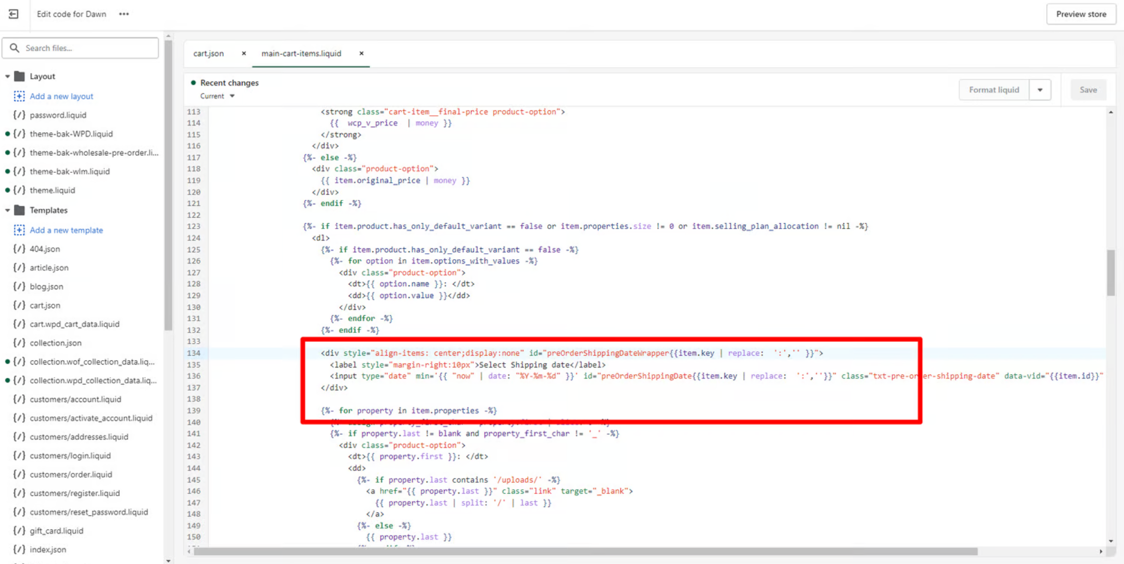 <div style="align-items: center;display:none" id="preOrderShippingDateWrapper{{line_item.key | replace: ':','' }}"><label style="margin-right:10px">Select Shipping date</label><input type="date" min='{{ "now" | date: "%Y-%m-%d" }}' id="preOrderShippingDate{{line_item.key | replace: ':',''}}" class="txt-pre-order-shipping-date" data-vid="{{line_item.id}}" data-key="{{line_item.key}}"/></div>Please note: Use the same variable name as in the for loop, for example, it can be item, line_item, or any custom name depending on the theme.