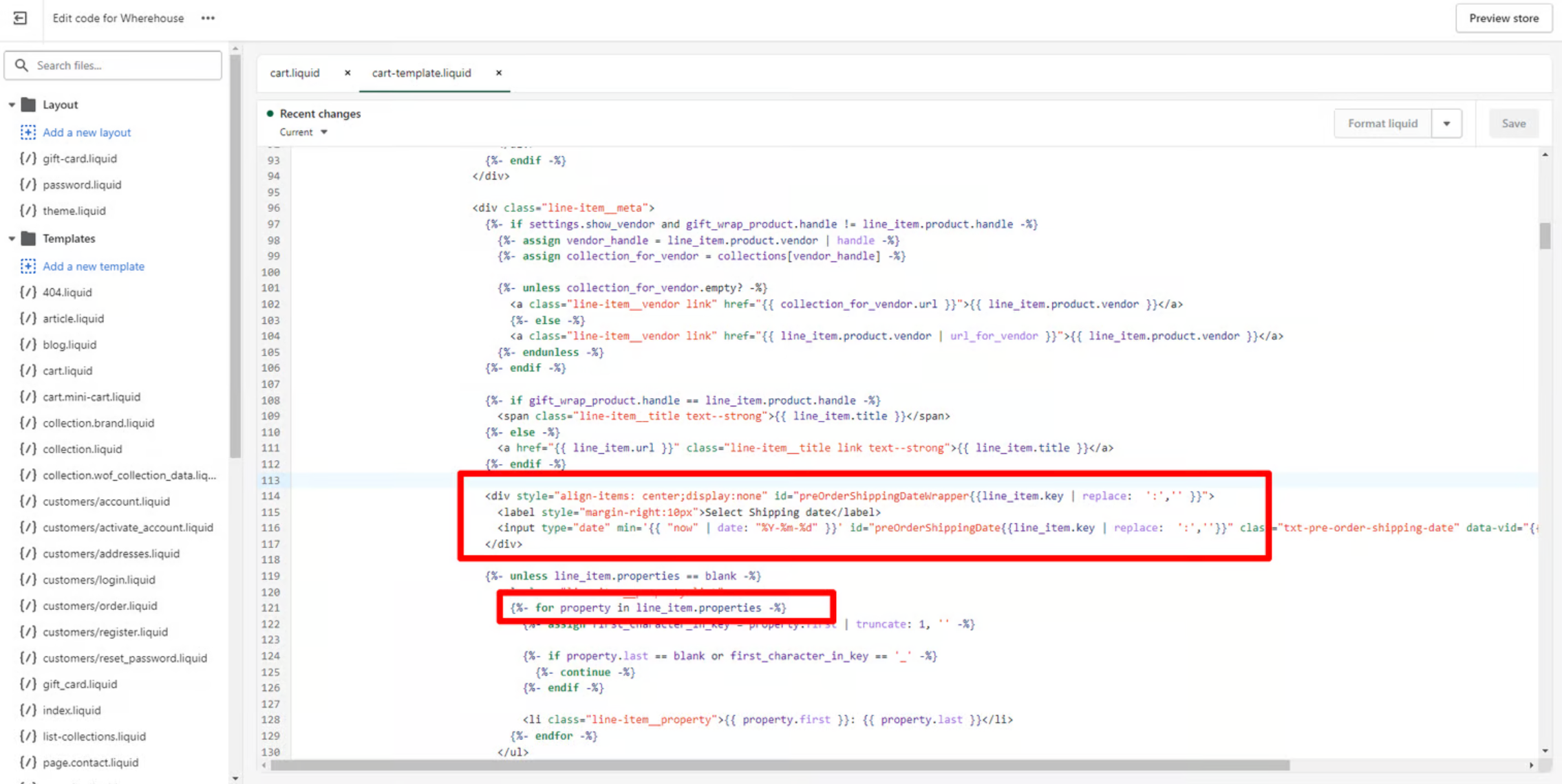 cart-template.liquid or cart.liquidormain-cart-items.liquid(as file names may vary for different themes).Open the file and find the line within the file as shown below: