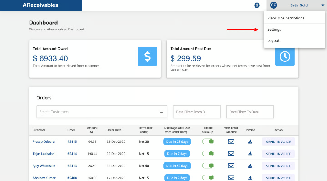 In the top navbar, click on SETTINGS in the dropdown on the right-hand side