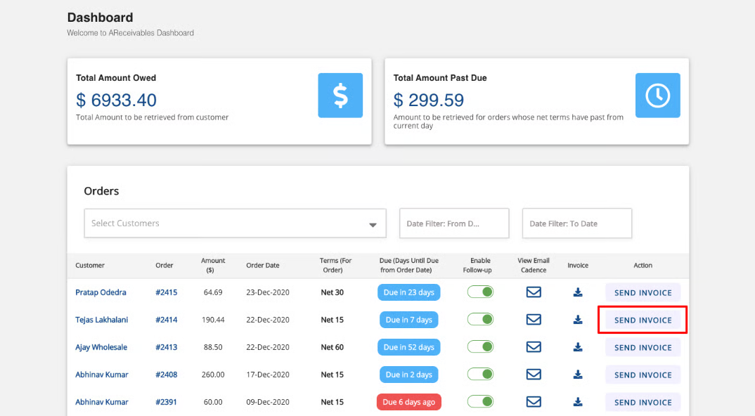 For CUSTOM NET TERMS, an email will be sent a day PRIOR to the date when net term days are getting over, on the day when net term days are finishing and every 15 days after past due