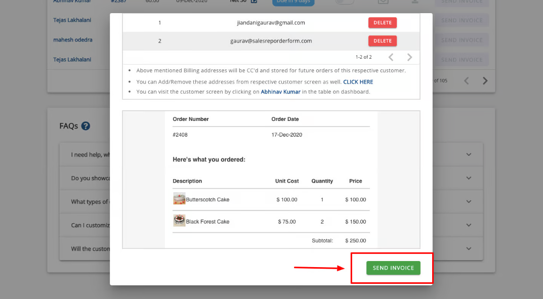 It will open up a modal. You can see your details and email preview and thereafter click on SEND INVOICE at the bottom right, which will send the invoice.