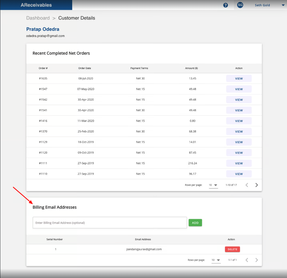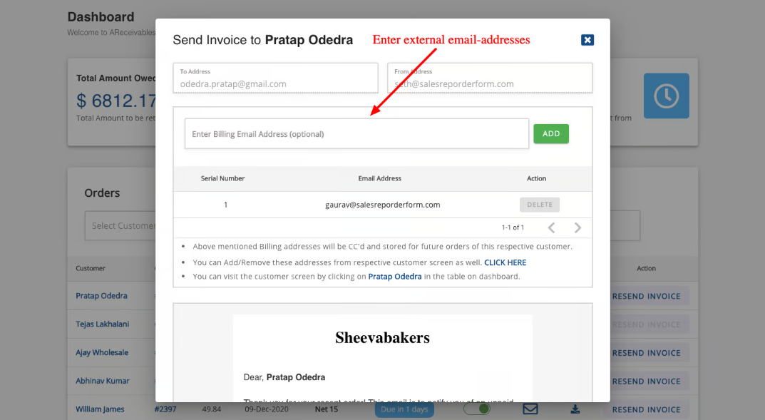 3. You can add/delete these email addresses from the customer screen as well. (Just click on the Customer name on the dashboard)
