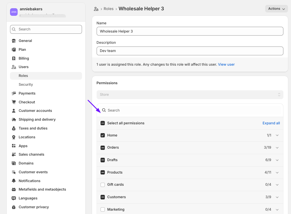 OR if you have already given us staff access, then go to Users, select our account. If it's a staff account, it would be under the email "themes@wholesalehelper.io".You can then edit the same role or add a new role with the updated permissions and assign to the user. Click Roles (or Edit permissions, depending on your UI) and search for the role you want to edit/add these permissions for. Click on the name of the role you added (here ex: Wholesale Helper 3)