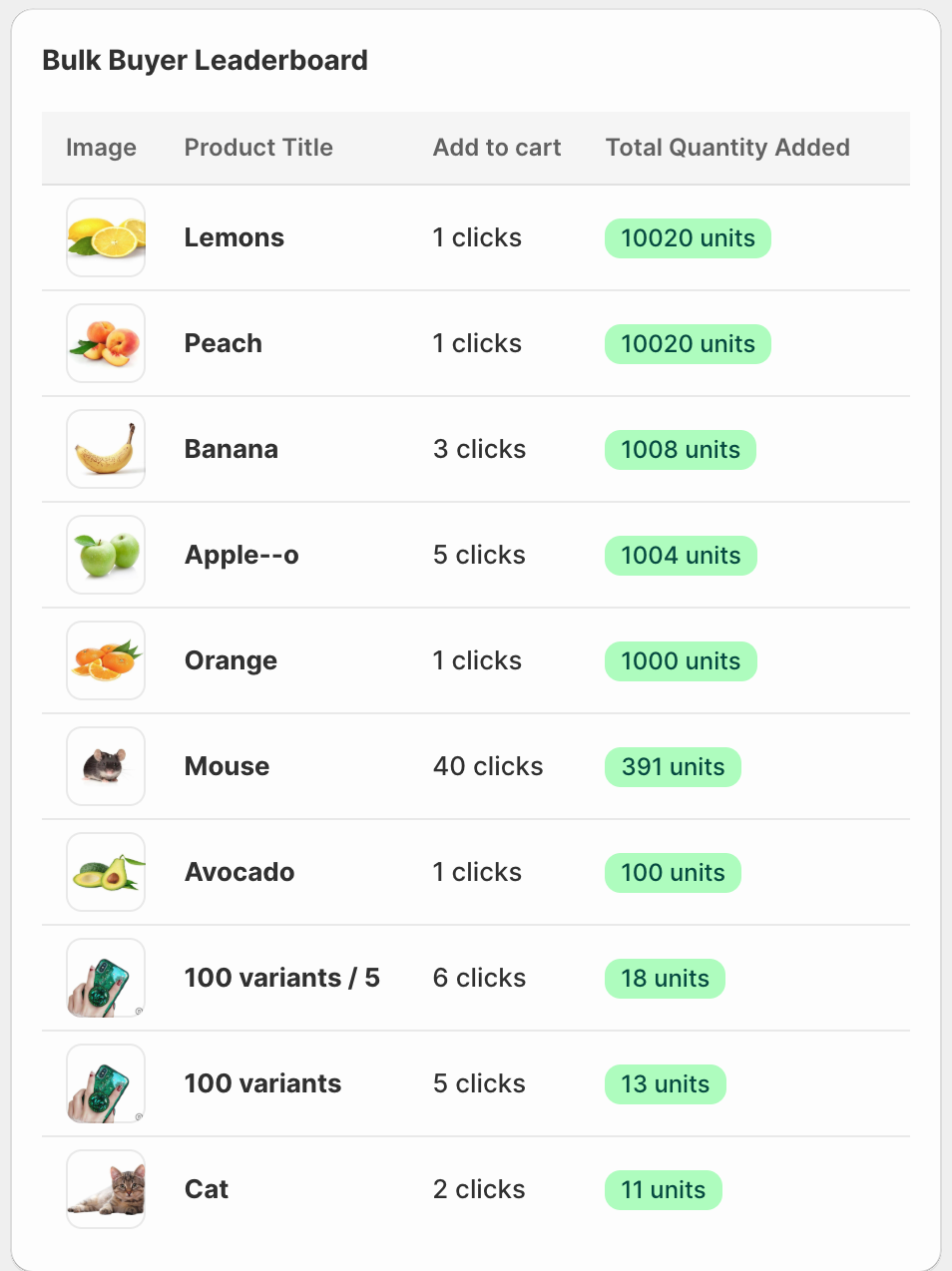 A ranked list of products by total units added to cart (not just how many times they appeared in orders).