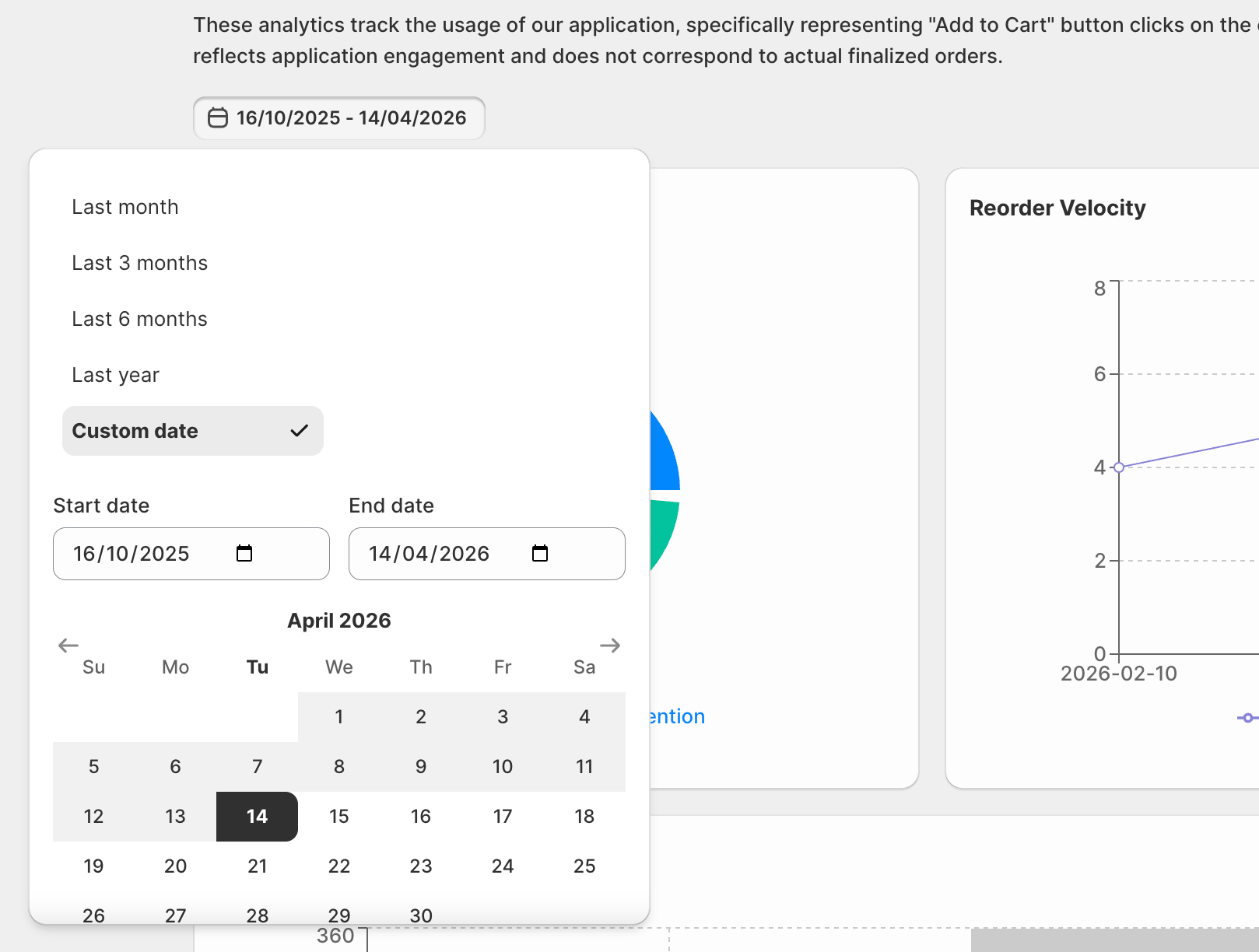 - Click the calendar icon next to the date range shown at the top of the dashboard (e.g., 15/03/2026 – 14/04/2026).