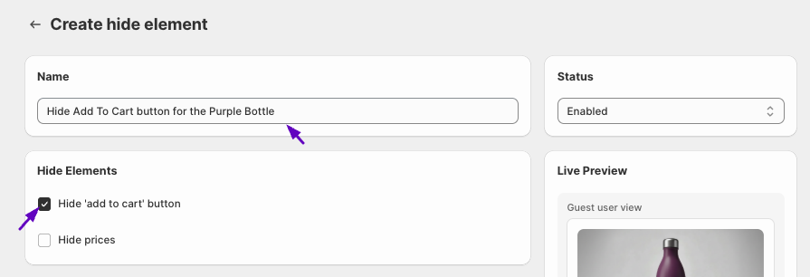 - Under Hide elements, enable Hide 'add to cart' button.