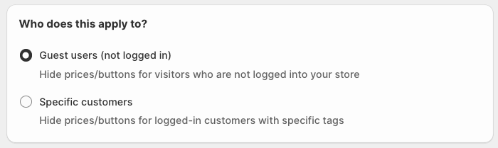Option 2: Specific customers (customers with the required customer tag(s)): This setting will allow you to hide your Add To Cart button from specific customers you already have in your store and are tagged with the specific tag(s), for ex, "VIP", "Tier1", etc. (check image below)