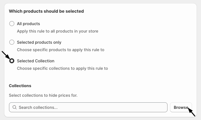 Selected Collection (Click on Browse button to pick the collection): If you select this setting, you can choose to hide the Add To Cart button for a 'specific collection' on your store from your 'specific customers'.