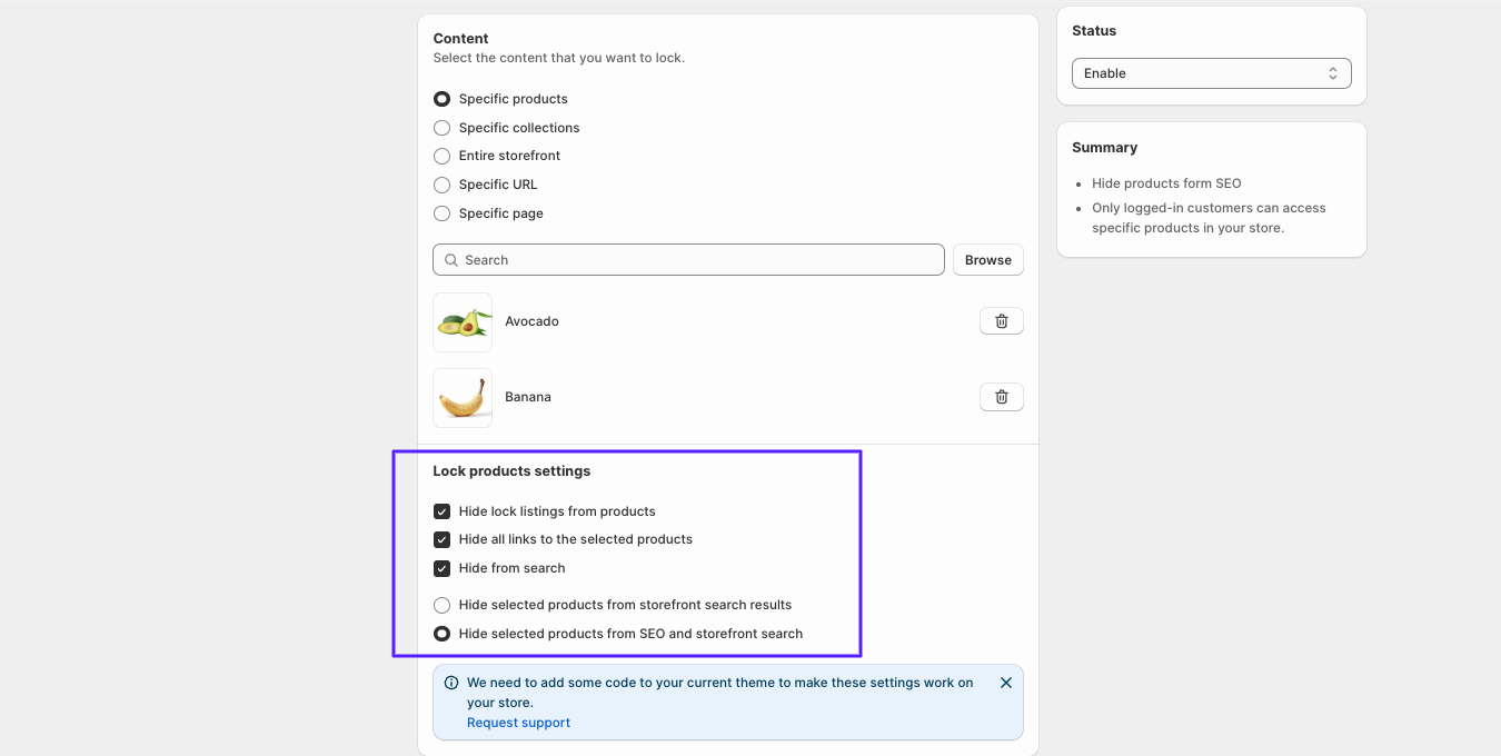 - Hide lock listings from products: If enabled, the selected products will be hidden from collection pages.