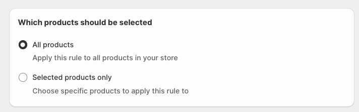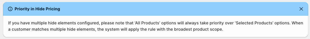 Option 1: All products: This setting allows you to hide prices of all the products you have in your store.Option 2: Selected products only (pick the products): If you select this setting, you can choose to hide the prices of specific products on your store from your 'specific customers' in the above step.