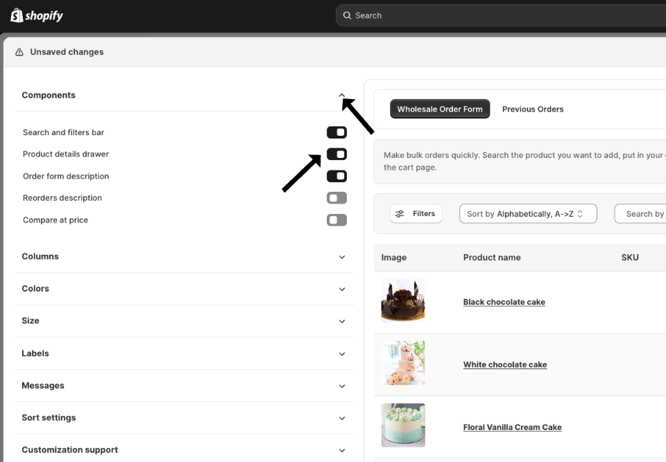 2. Scroll to the Components settings from the left menu > Enable the Product details drawer button.