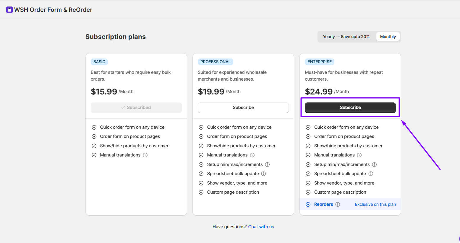 - Then click Subscribe on the Enterprise Plan. You would incur $24.99 (if no discounts are applied) charges for this plan. No installation is needed, just subscribe and start using it.