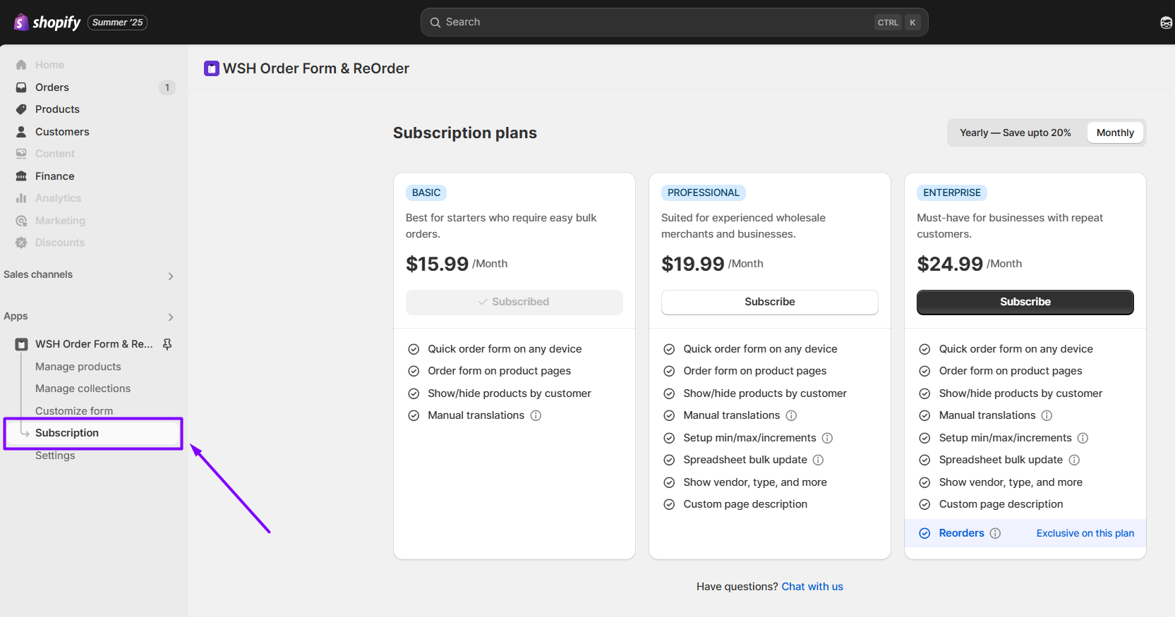- Open your WSH Order Form & ReOrder app and click on the Subscription menu on the left.