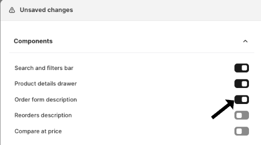 - Look for Component settings > ‘Order form description’ and click the checkbox.