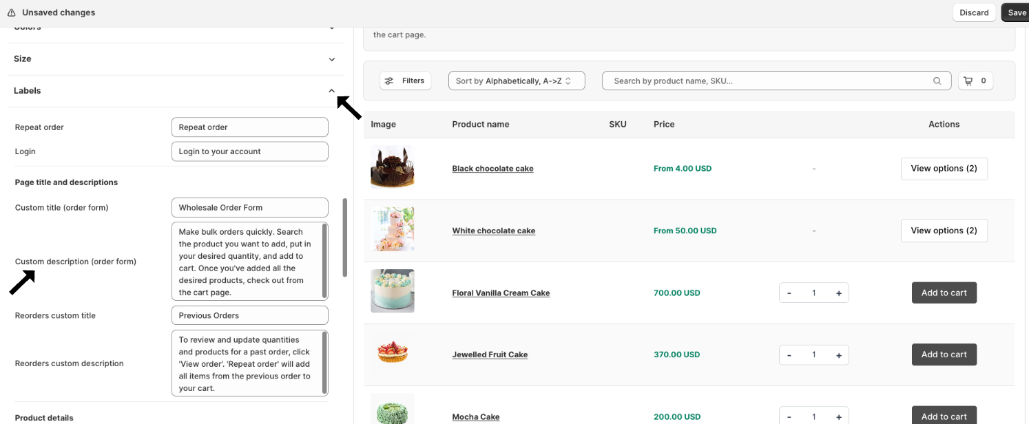 Now, scroll to the Labels settings in the same window. Scroll to the Page title and descriptions > Custom description (order form)