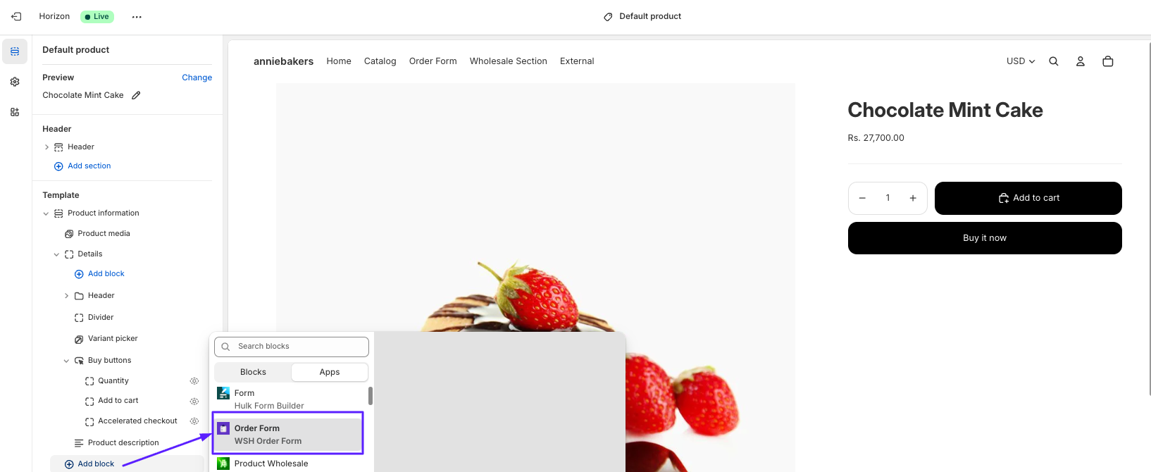 After adding the Wholesale Order Form app block to your current theme, go to the product page and check if the block has been added.