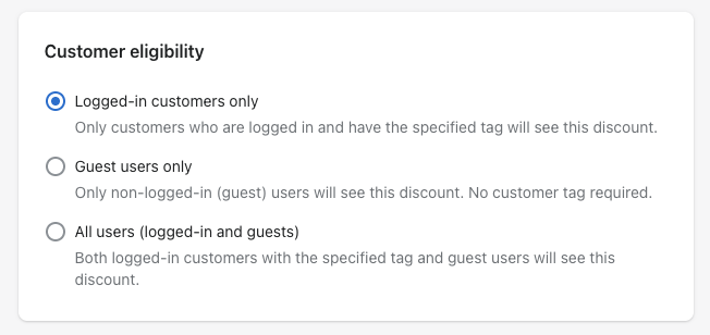 If you are using the Professional plan or above, you can also use Customer eligibility to control whether the discount is shown to logged-in customers, guests, or both.